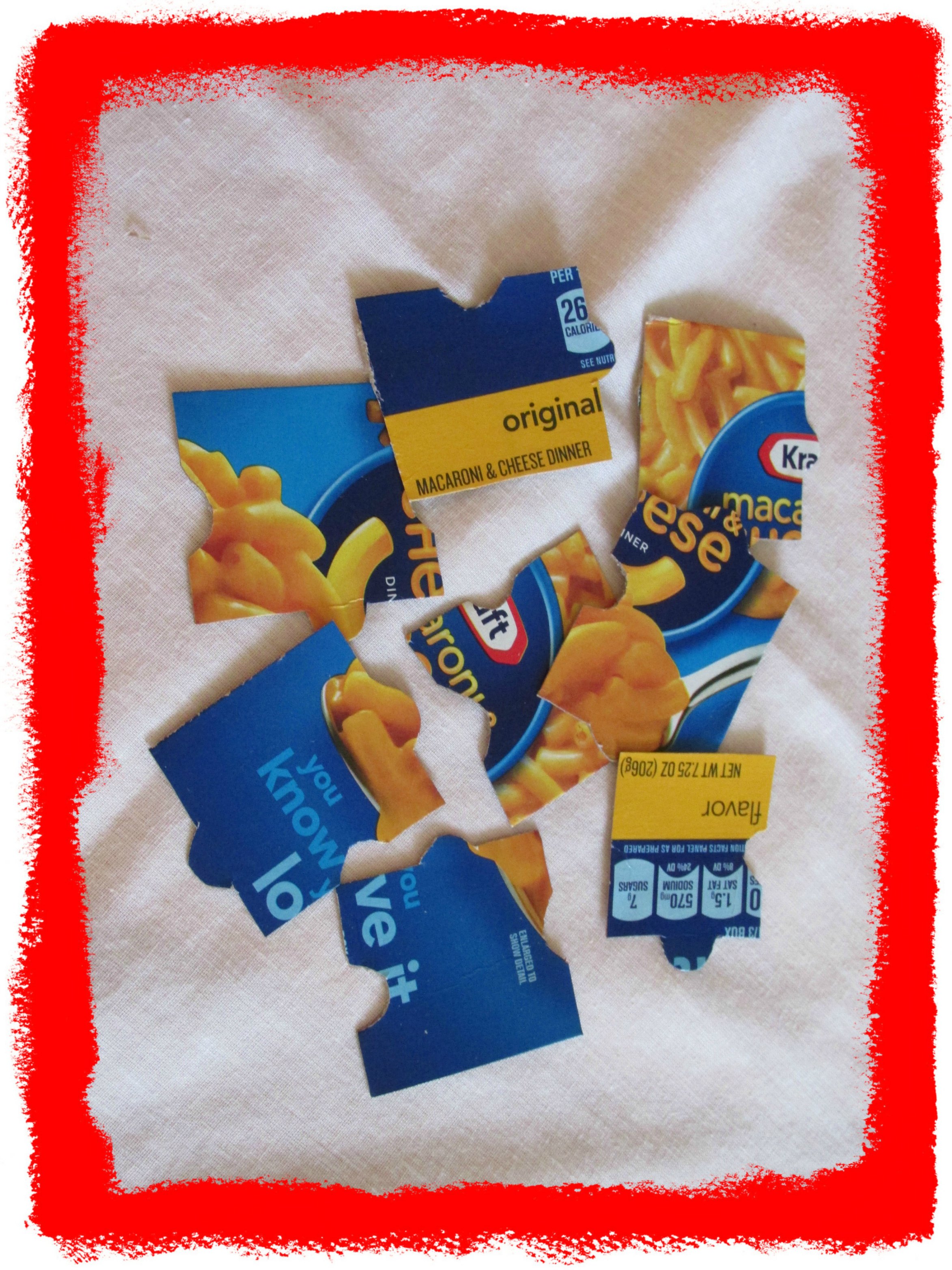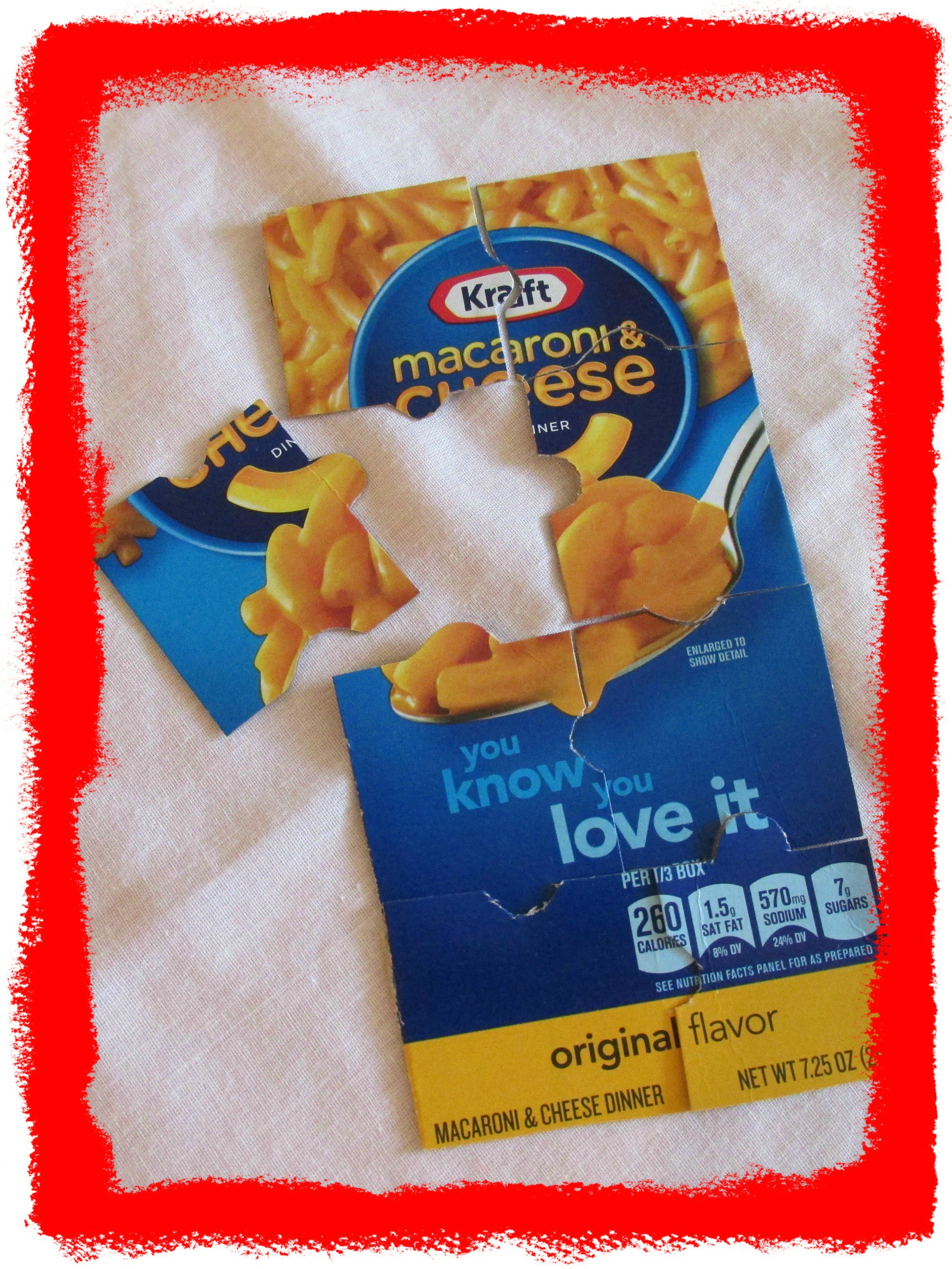 “When will lunch be ready?” Kids have a hard time waiting. It is a tradition at our house to begin making Mac-n-Cheese and then use the box to create a puzzle. You simply cut off the front of the box. Then cut it into puzzle pieces that fit your child’s ability—whether it is three pieces or ten. Next watch with a smile as your hungry child gets side tracked and starts putting together the puzzle. Enjoy lunch!